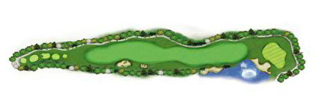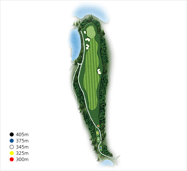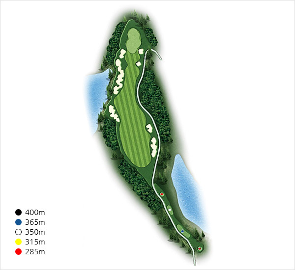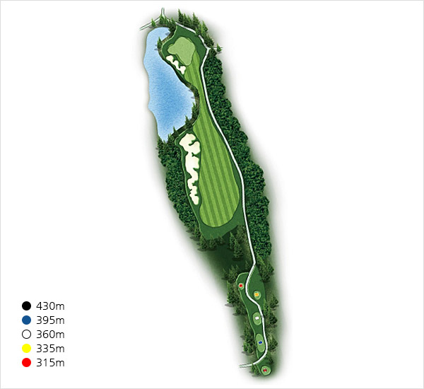 마지막홀이어서 약간의 난이도와 S-라인의 매력을 맛볼수 있으며 IP와 그린사이가 잘록한 허리로 그린이 연못에 접해있는 날렵한 홀이다.