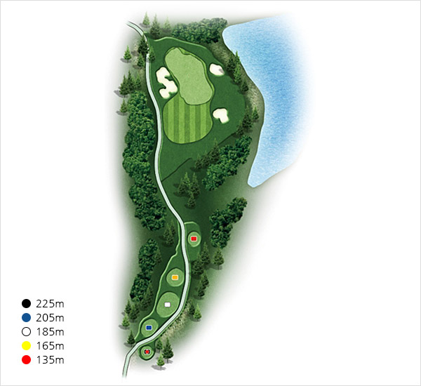 경사가 심한 내리막 파 3홀입니다. 거리보다 15~20M 짧게 공략해야 하며 바람의 세기와 방향에 따라 거리 계산에 유의 하셔야 합니다. 좌.우측이 해저드이며 그린 뒤에도 4번홀 해저드와 병행됩니다.